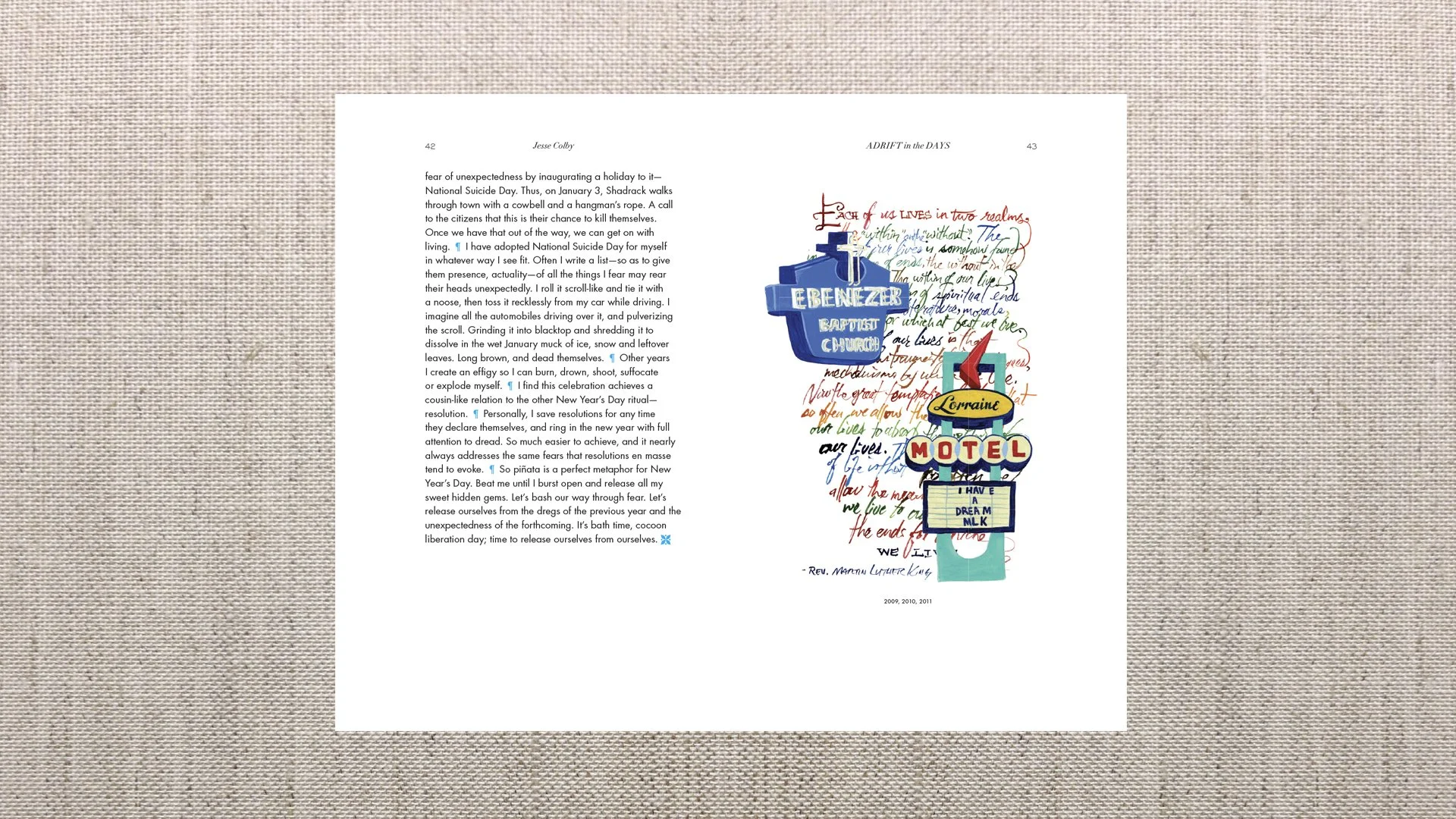 This semester-long grant allowed me studio space and access to book-making equipment to create Adrift in the Days, a collection of more than 70 illustrations and 12 essays deconstructing what makes holidays unique, and a glossary of the various meanings of the word “day.” The book was digitally printed and bound by hand.