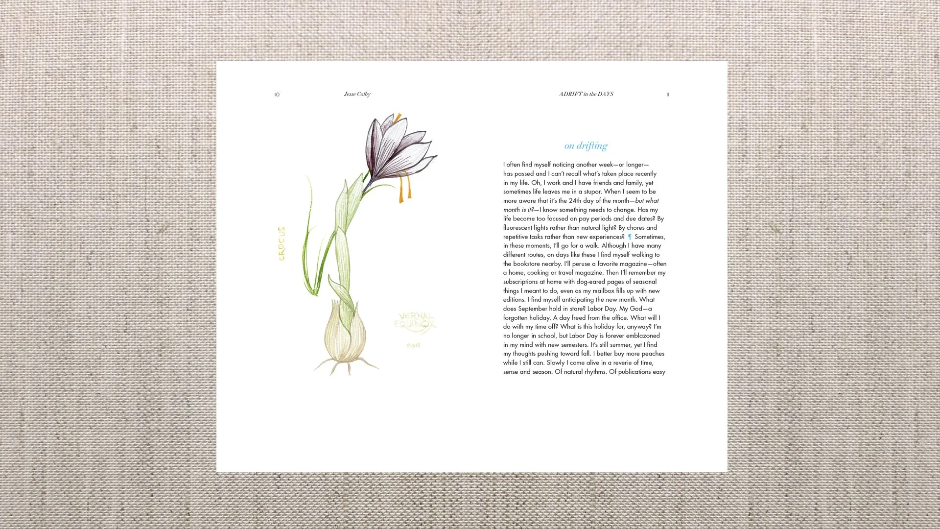 Adrift in the Days is a visual and written essay inspired by annual rhythm. Each day of the year has an eve, a day, and a morrow. Anticipation, commemoration, and reflection are equivalent ways of moving more fully through the year. We may pause for observances and holidays, indeed they are days to savor, but every day is unique.