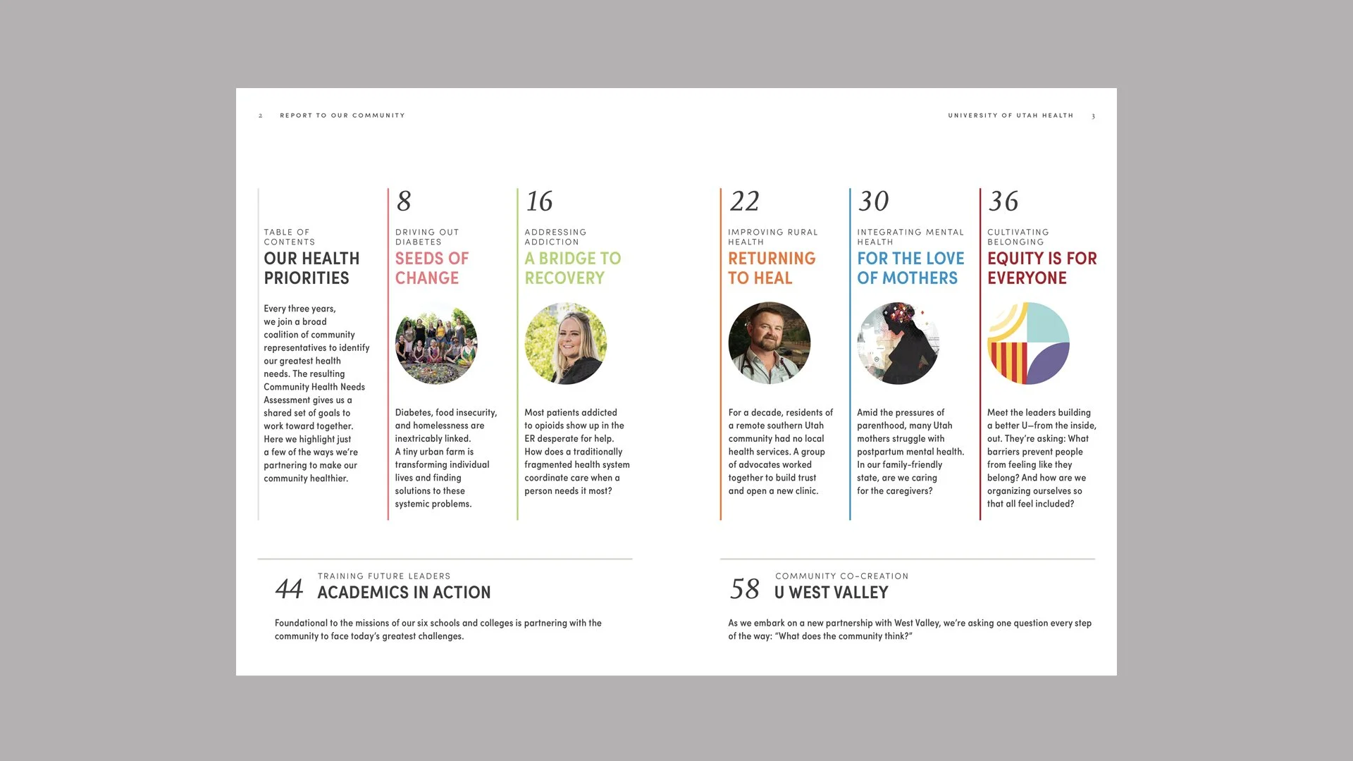 Crafting this narrative was no small feat. It had to align with the biannual Community Health Needs Assessment, which prioritized diabetes, suicide prevention, opioid abuse, and rural healthcare access. Additionally, it wove together the distinct efforts across U of U Health’s extensive network of five hospitals, 12 community clinics, six schools and colleges, and hundreds of research labs. The narrative also catered to Utah’s rapidly diversifying population.