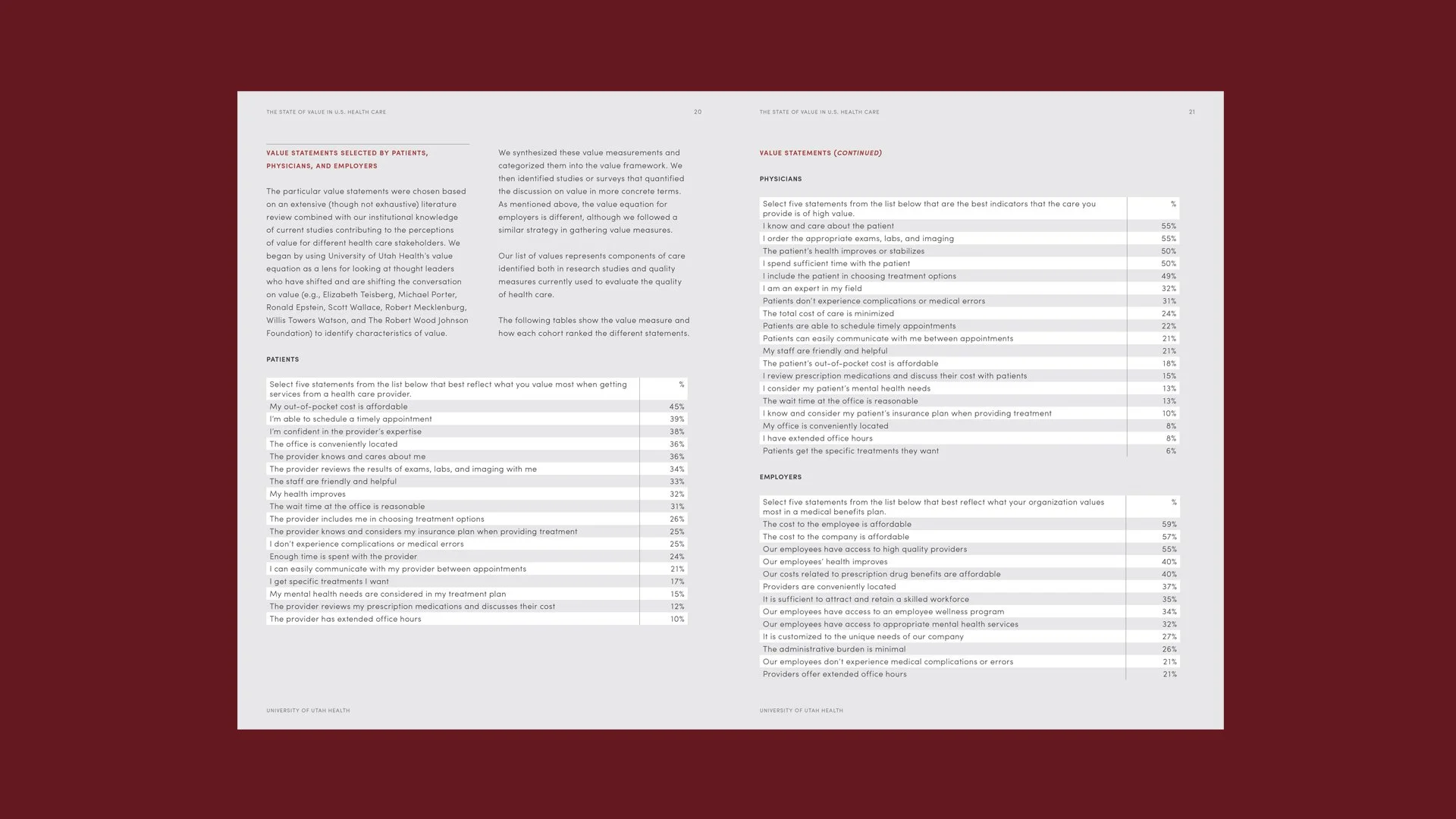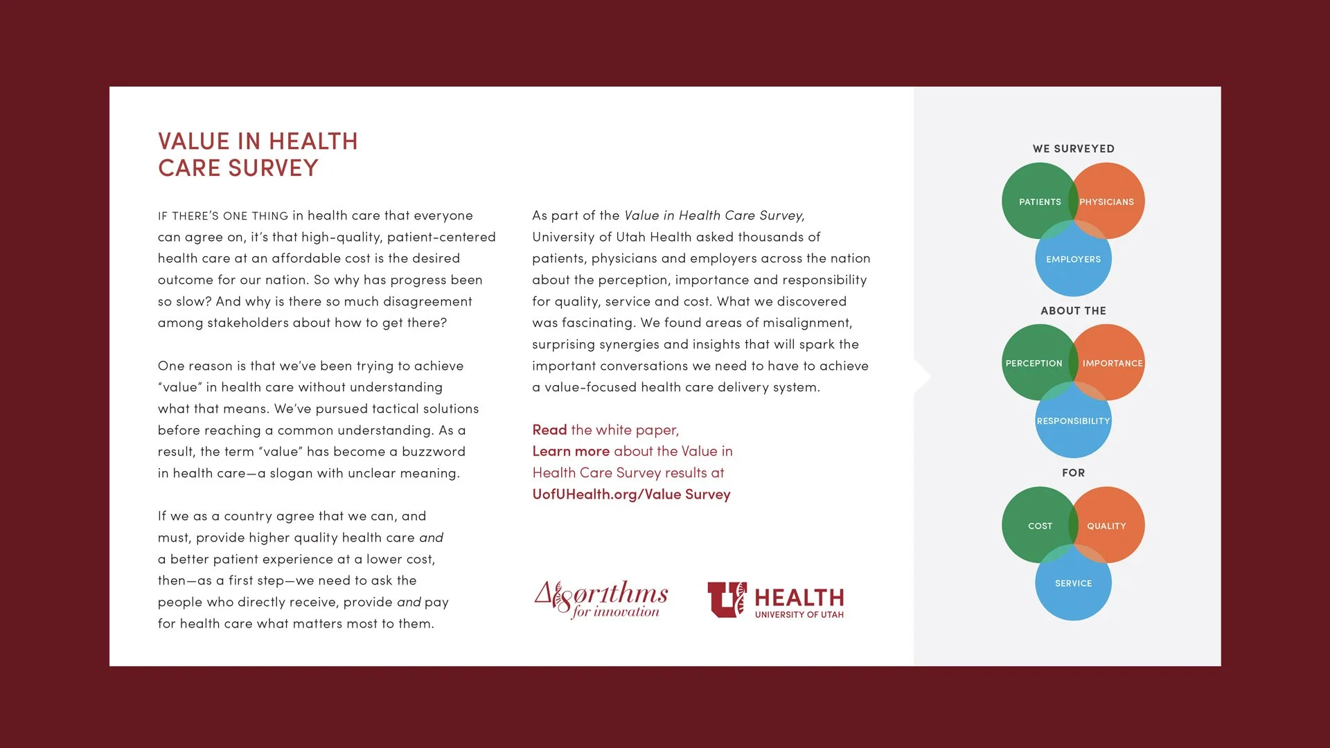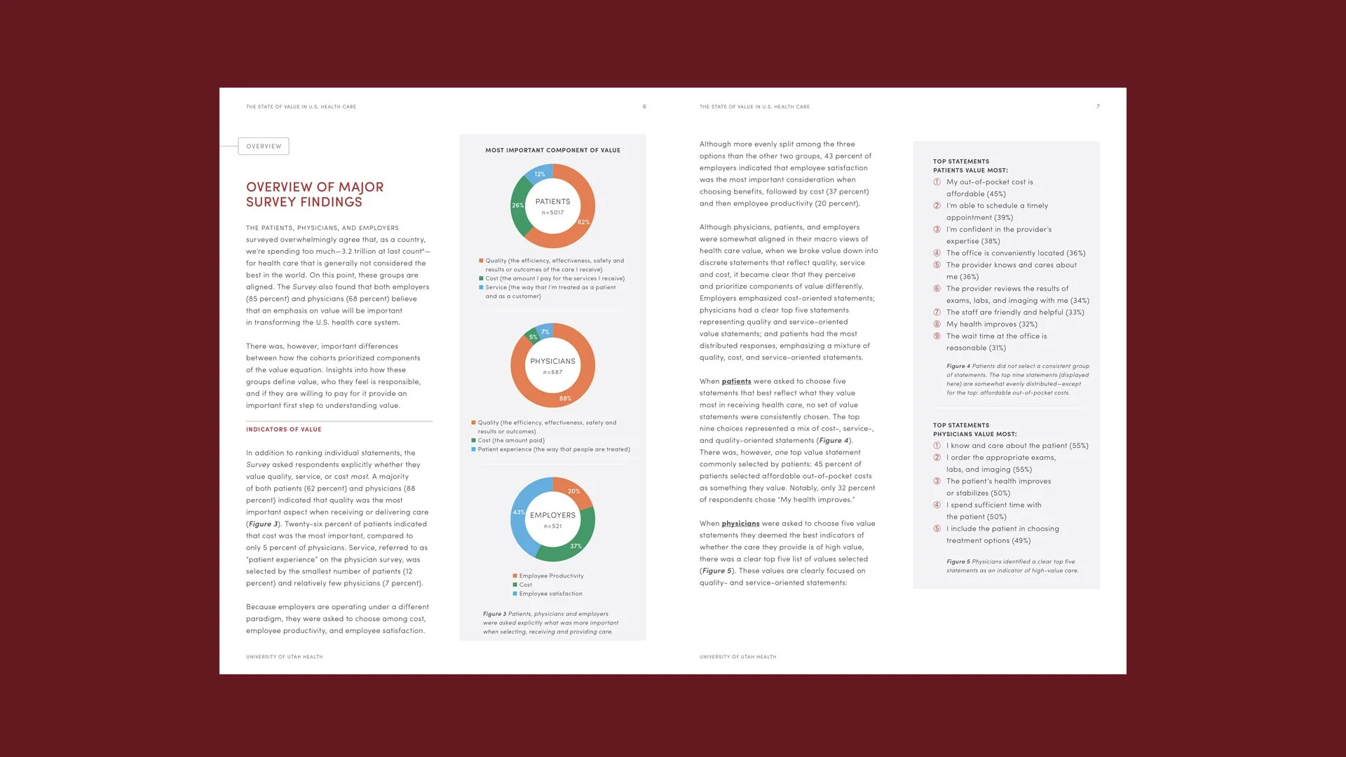 University of Utah Health joined Leavitt Partners to conduct a nationwide survey to find out what three key audiences – consumers, providers and employers – think about value as a concept, as well as its component parts (cost, quality and service) to improve U.S. health care.